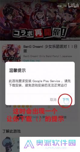 2、这时会出现一个提示,此游戏要求安装Google Play Service,不用管它点击下载即可。