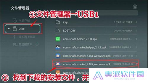 3、在文件管理器→USB1栏目里找到沙发管家安装文件,按确定。