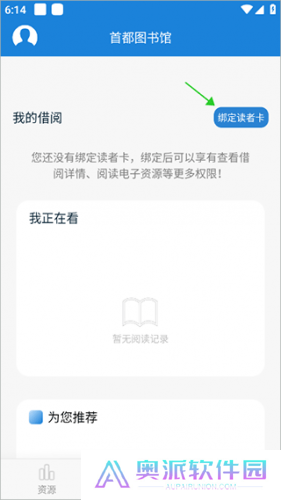 3、进入页面后点击右上角的 "绑定读者卡" 进行读者卡绑定。